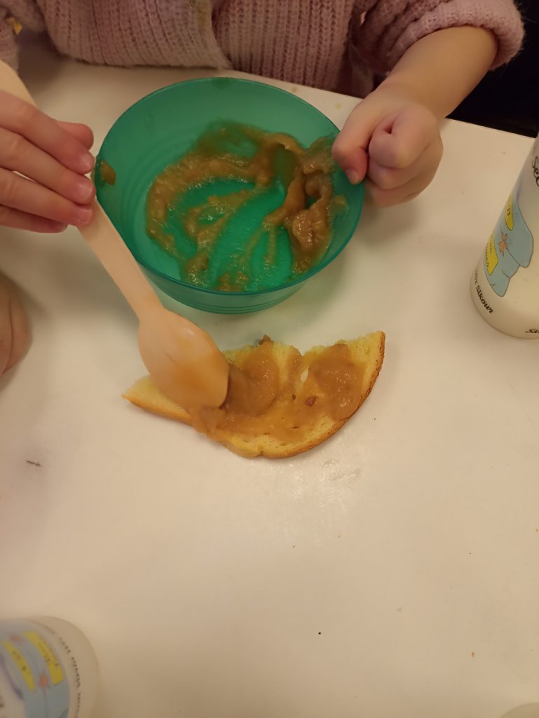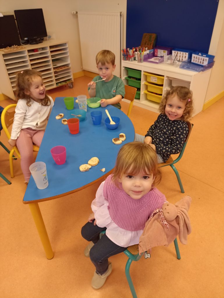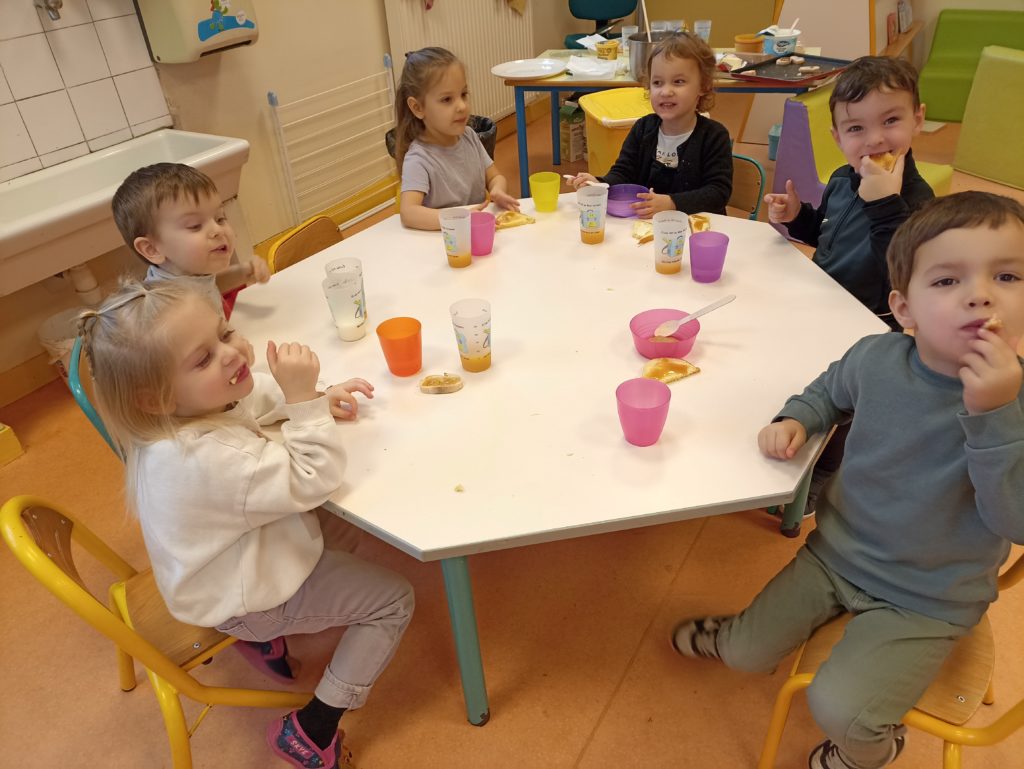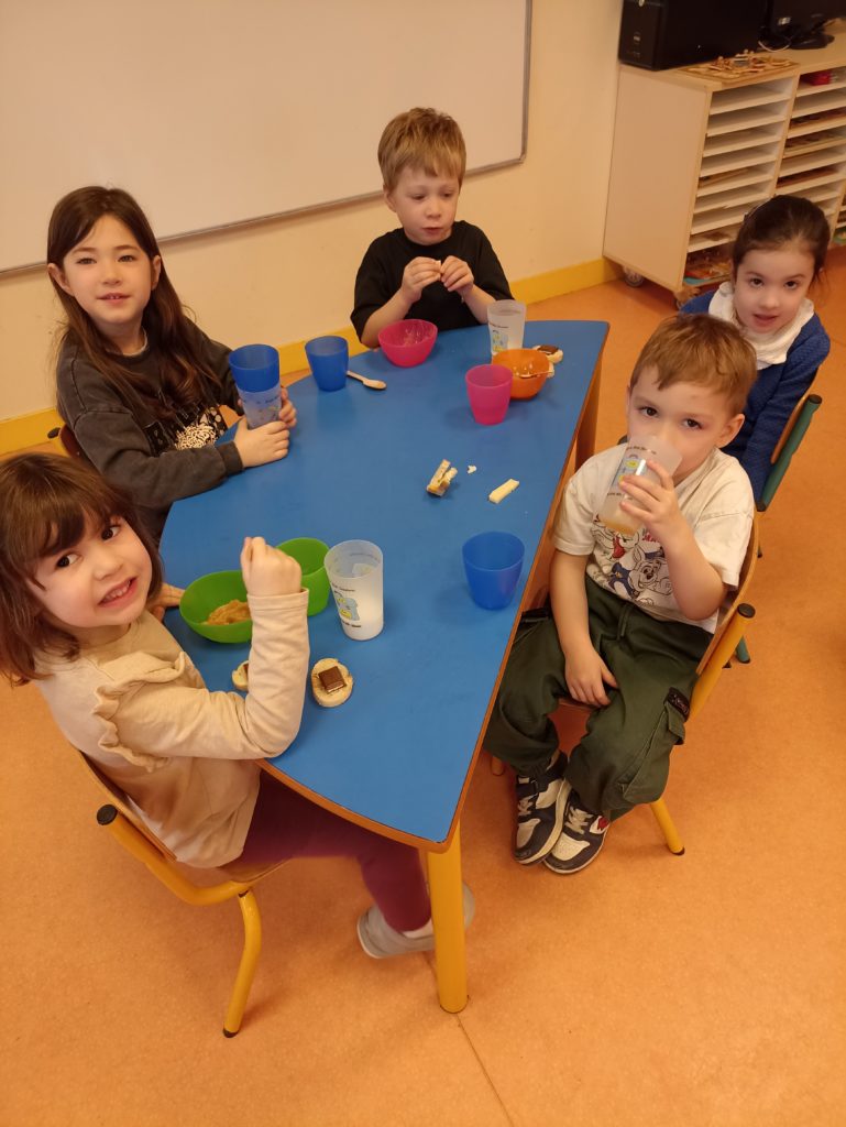 Au cours du mois de février, la classe de TPS PS MS de Virginie a mené un projet autour du petit déjeuner. Après avoir découvert les apports de chaque famille d’aliments, les enfants ont fait leur choix sur le « menu » (compote de pommes, yaourt, fromage, pain, brioche, beurre, confiture, chocolat, miel, lait, jus de fruits). Nous avons compris que pour que le petit déjeuner soit équilibré, il nous faut un aliment de chaque famille.